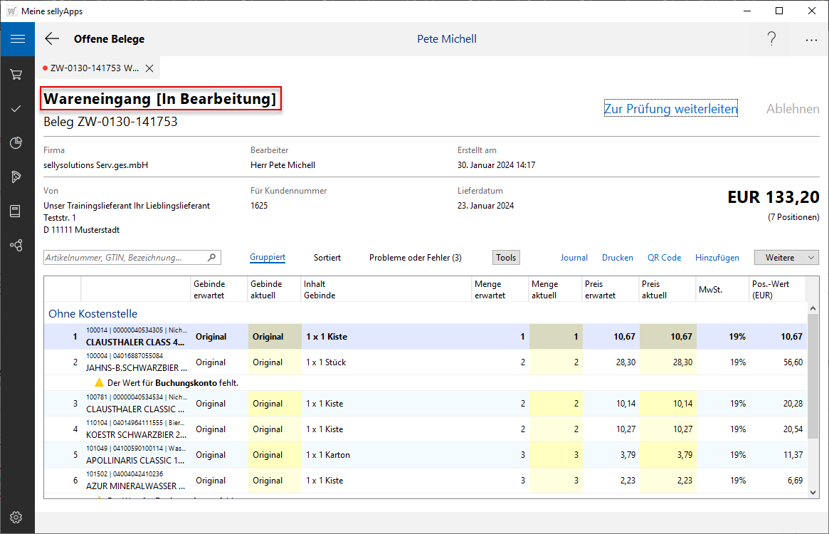 drei Belegpositionen nicht fehlerfrei bzw. bedürfen eine Sichtung, durch den Bearbeiter.