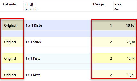 Falls die Lieferung von der Bestellung hinsichtlich Menge, Preis oder auch Gebindegröße, abweicht, können Sie hier Anpassungen vornehmen, bevor Sie den Beleg buchen. Den tatsächlichen Wert geben Sie in das zutreffende gelb markierte Feld ein (s. Markierungen rechts) und bestätigen die Eingabe mit ENTER (s. Belegposition korrigieren).