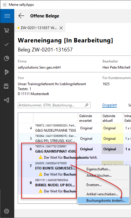Sie wählen die zutreffende Kontogruppe und ein Buchungskonto. Im Beispiel gehören die markierten Positionen zu den Fertiggerichten. Das Ergebnis der Auswahl sehen Sie im rechten Bild.