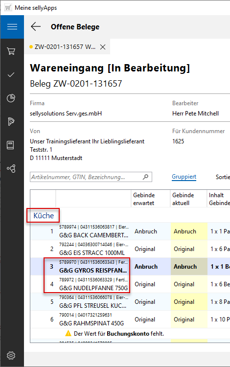 Fehlt bei mehreren Positionen die Angabe des Buchungskontos und gehören diese Artikel auch zum selben Konto, können Sie den Wert des Buchungskontos für diese Positionen zusammengefaßt anpassen.