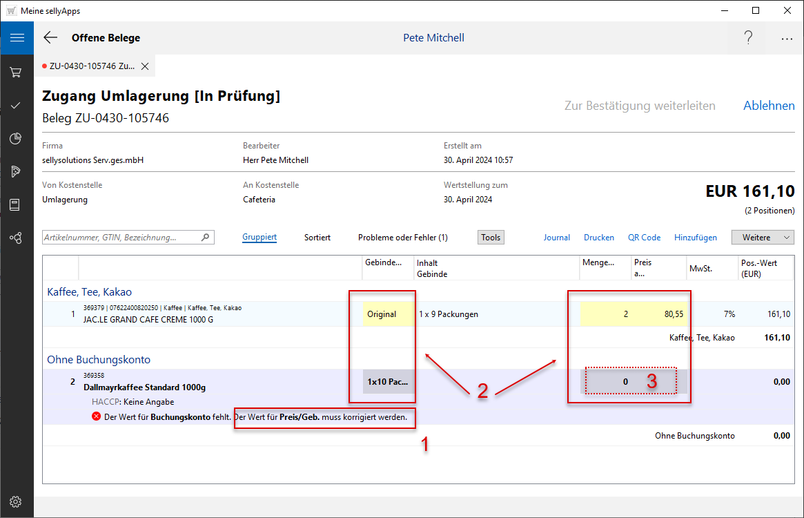 Sind die Angaben in Ihrem Umlagerungsbeleg hinsichtlich der Gebinde-, Mengen- oder Preisangabe