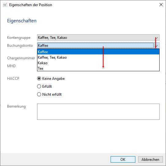 Um eine Kontengruppe bzw. Kostenstelle zu wählen, die Chargennummer oder MHD zu hinterlegen bzw. eine zutreffende HACCP-Angabe zu wählen oder eine Bemerkung einzutragen, nutzen Sie ebenfalls das Kontextmenü der rechten Maustaste.