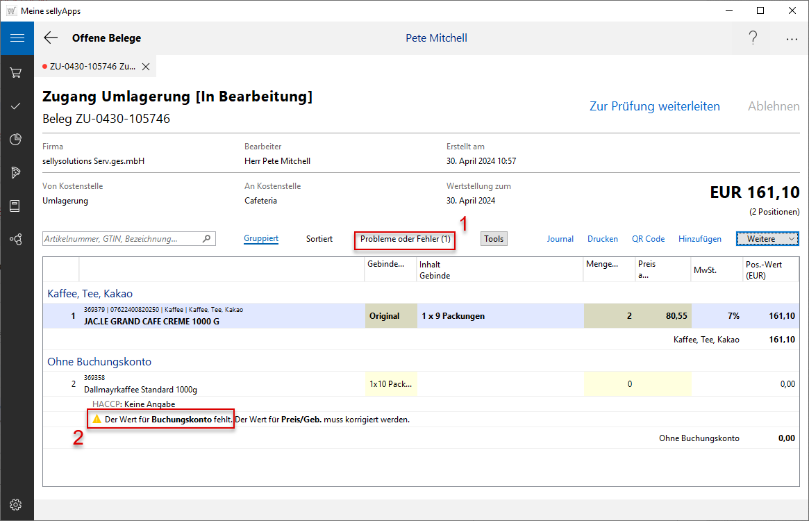 Sollten an Belegpositionen Fehler bzw. Hinweise vorliegen, die eine Weiterverarbeitung des Beleges verhindern, werden diese Positionen zusätzlich in der separaten Liste Probleme oder Fehler