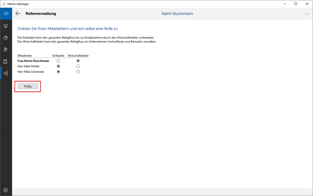 Haben Sie die Rollen und damit Rechte für sich und Ihre Mitarbeiter definiert, beenden Sie den Vorgang mittels Klick auf [Fertig].