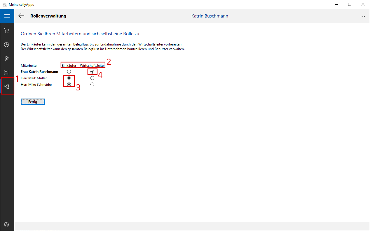 sellyApps. Sie starten daher die Rollenverwaltung, nach Anmeldung an den sellyApps, über das Kreissymbol (s. Markierung 1) und sehen jetzt alle Nutzer Ihres
