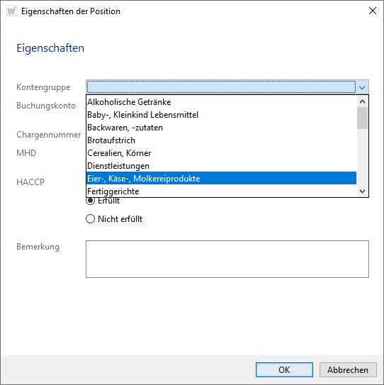 Um eine Kontengruppe bzw. Kostenstelle zu wählen, die Chargennummer oder MHD zu hinterlegen bzw. eine zutreffende HACCP-Angabe zu wählen oder eine Bemerkung einzutragen, nutzen Sie ebenfalls das Kontextmenü der rechten Maustaste.