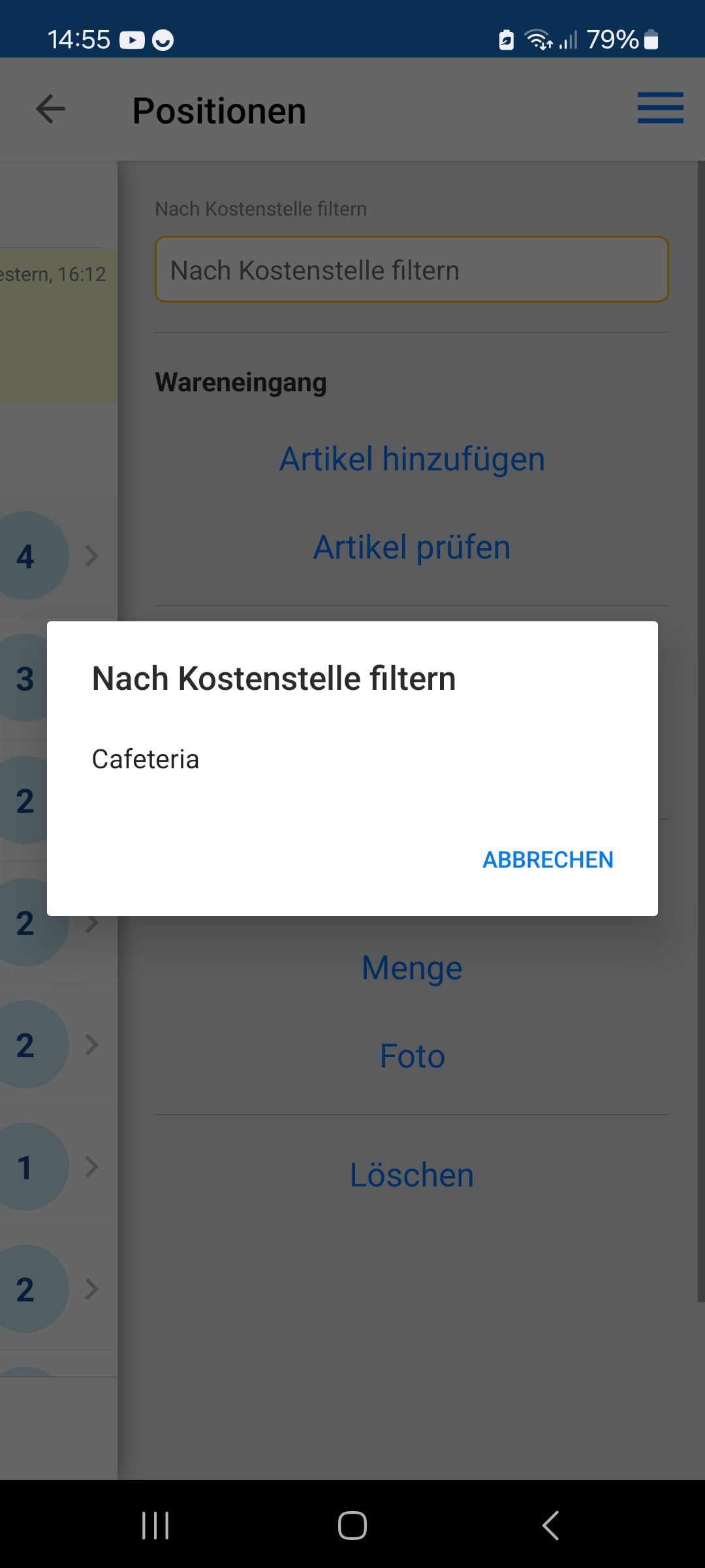 Gehören die Positionen in Ihrem Beleg zu mehr als einer Kostenstelle, besteht über die obere Liste Nach Kostenstelle filtern die Möglichkeit die Liste, für die Bearbeitung, auf eine einzelne Kostenstelle einzuschränken (s. links Markierung 2 + Bild rechts).
