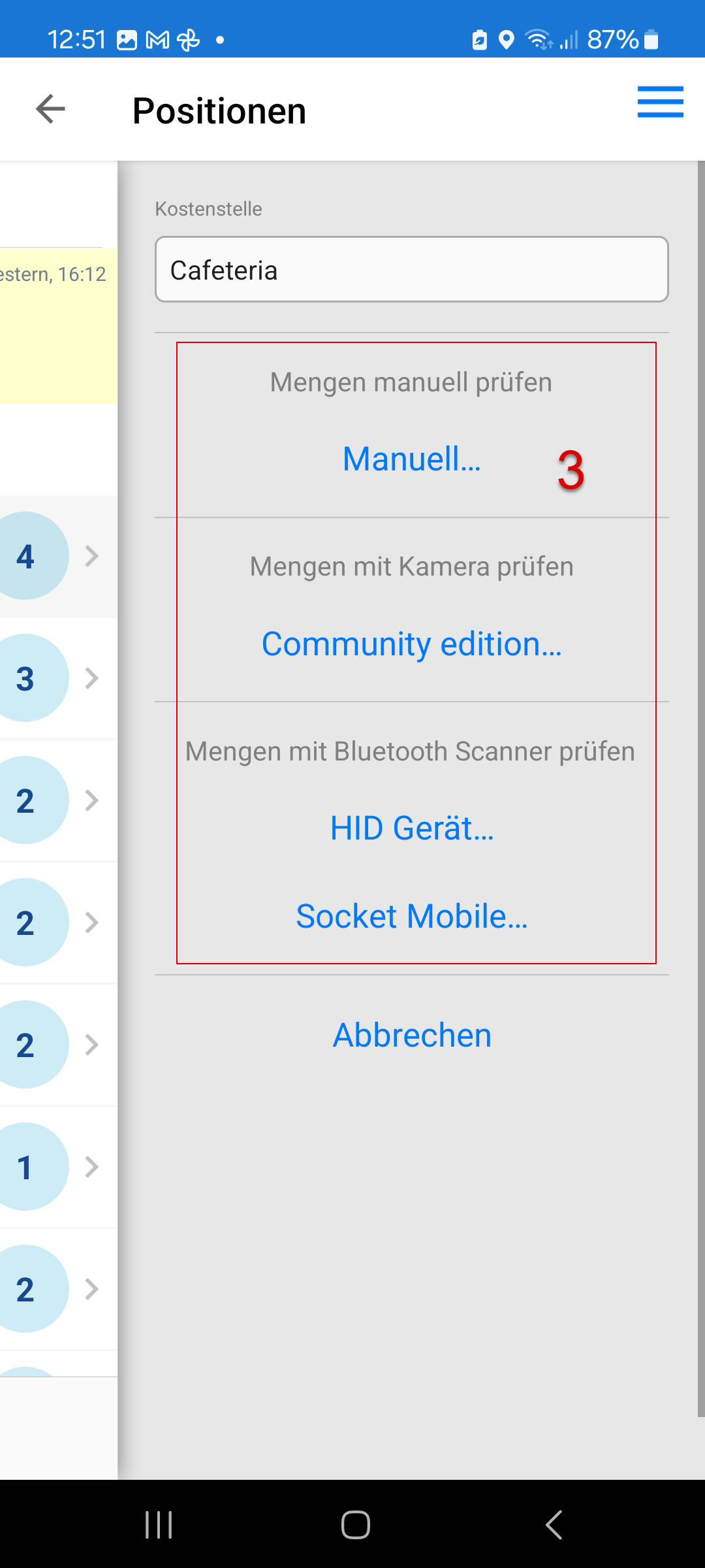 Um Artikel zum Beleg zu ergänzen oder eine Positionsmenge zu prüfen, nutzen Sie die Funktionen Artikel hinzufügen und Artikel prüfen (s. oben Markierung 3).