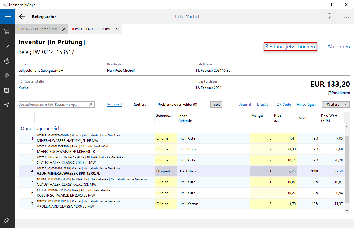 Alle Artikel aus der Bestellung wurden in diesen Beleg übernommen. Somit ist der Inventurbeleg erfolgreich erstellt worden.