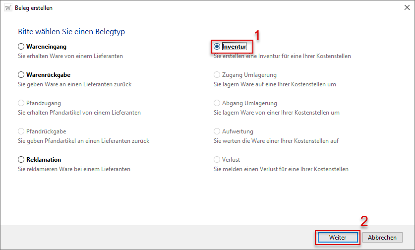 Schritt die Belegart aus (s. r. Markierung 1).