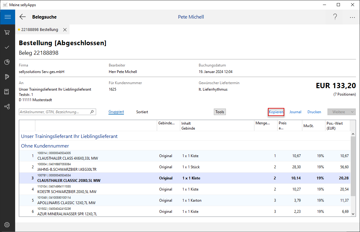Alle 7 Artikel aus der Bestellung wurden in diesen Beleg übernommen. Somit ist der Reklamationsbeleg erfolgreich erstellt worden.