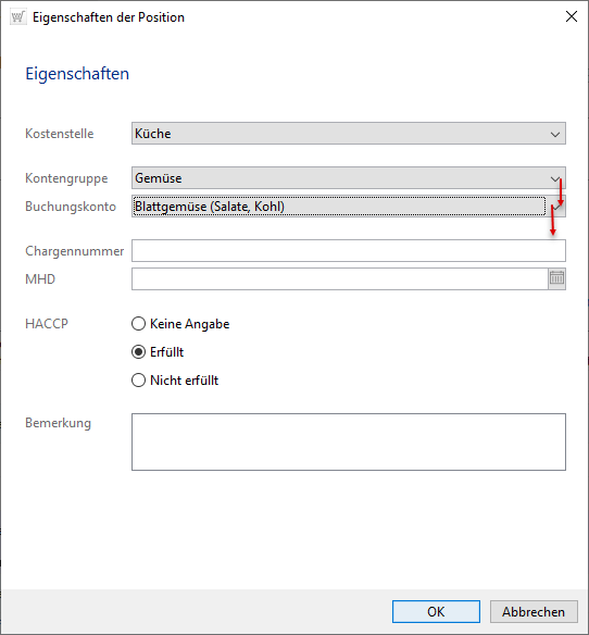 Die Nachpflege der Kostenstelle, der Kontengruppe und des Buchungskontos nehmen Sie im Dialog Eigenschaften der Position vor, welchen Sie über die rechte Maustaste oder nach Doppelklick auf die Zeile erhalten.