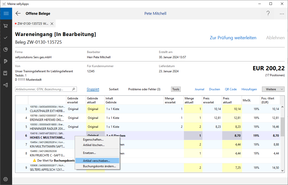 Zusätzlich zu den Funktionen im Eigenschaftsdialog finden Sie im rechten Mausmenü, die Funktion, um Belegpositionen auf