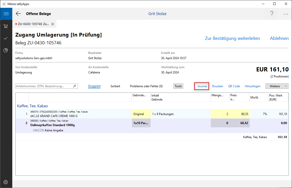Es werden jeweils die Belegübergänge von Bearbeitung zur Prüfung, von Prüfung zur Bestätigung und letztendlich von der Bestätigung zum Abschluss dokumentiert.