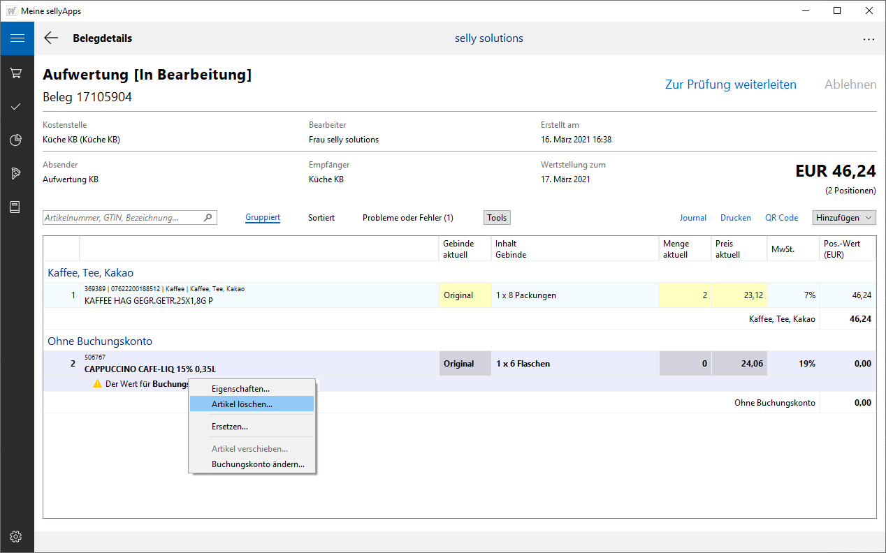 Schaltfläche [Jetzt löschen], wird die Position aus dem Beleg entfernt.