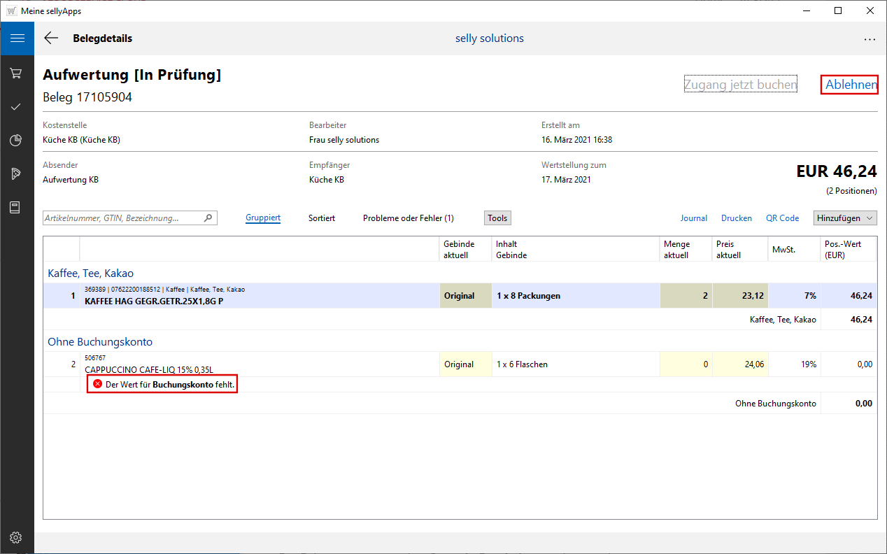 Im Bildbeispiel (links) fehlt bei einem Artikel die Angabe des Buchungskontos, somit ist der Beleg nicht korrekt und der Buchungsvorgang kann nicht abgeschlossen werden. Der Buchungsvorgang wird abgelehnt.