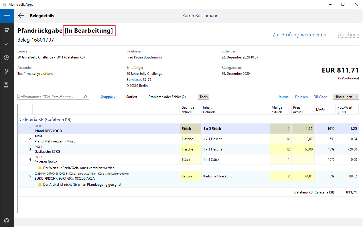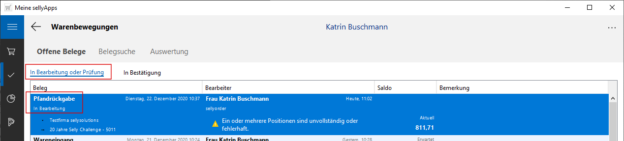 Ist bei einem Beleg mindestens eine Position mit dem Icon und einem Hinweis versehen, kann dieser Beleg in der Abfolge des Buchungsvorgangs trotzdem zur Prüfung weitergeleitet werden. Der Beleg hat nun den Status In Prüfung und muss jetzt spätestens korrigiert werden.