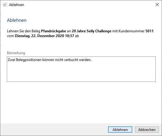 Erfolgt das Ablehnen muss im nachfolgenden Dialog eine Bemerkung angegeben werden.