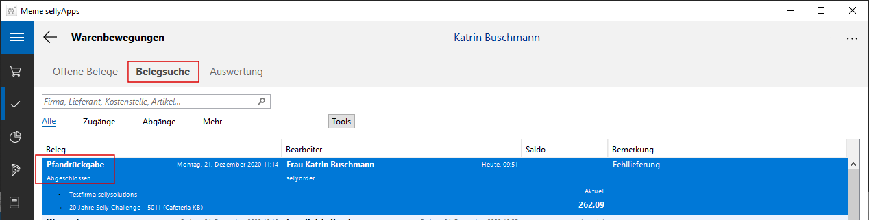 Der abgeschlossene Beleg ist jetzt im Belegarchiv zu finden. Der Aufruf bzw. die Ansicht erfolgt nun über den Funktionslink Belegsuche und hat jetzt der Status Abgeschlossen.
