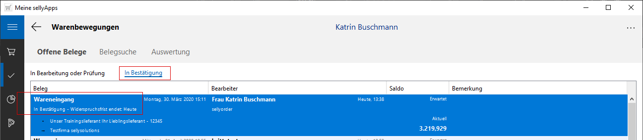 Der bestätigte Beleg ist nun in der Liste In Bestätigung und hat ebenfalls den Status In Bestätigung.