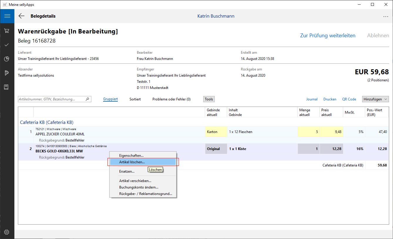 in die Positionszeile, das Kontextmenü und wählen den Eintrag Artikel Löschen....