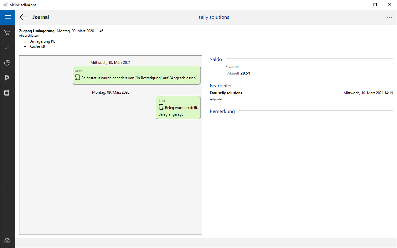 Im Journal sehen Sie die wichtigen Daten des Belegweges. So werden hier das Erstelldatum, der Bearbeiternamen, das zur Anlage genutzte Programm (sellyorder oder