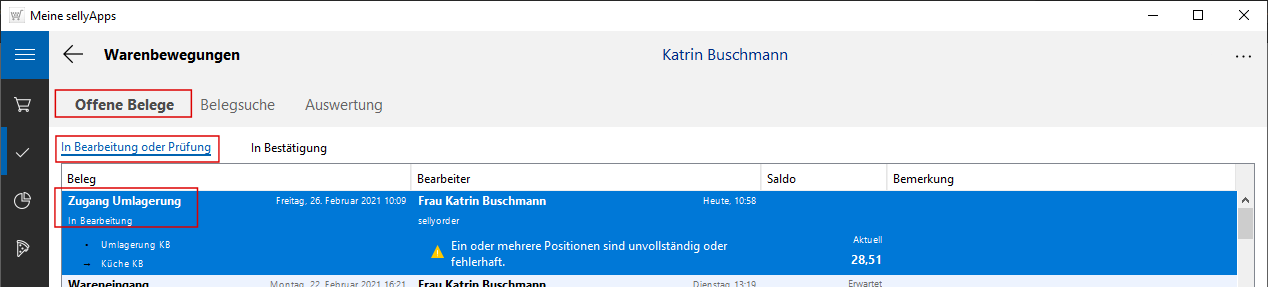 Der Beleg ist wieder mit dem Status In Bearbeitung gekennzeichnet.