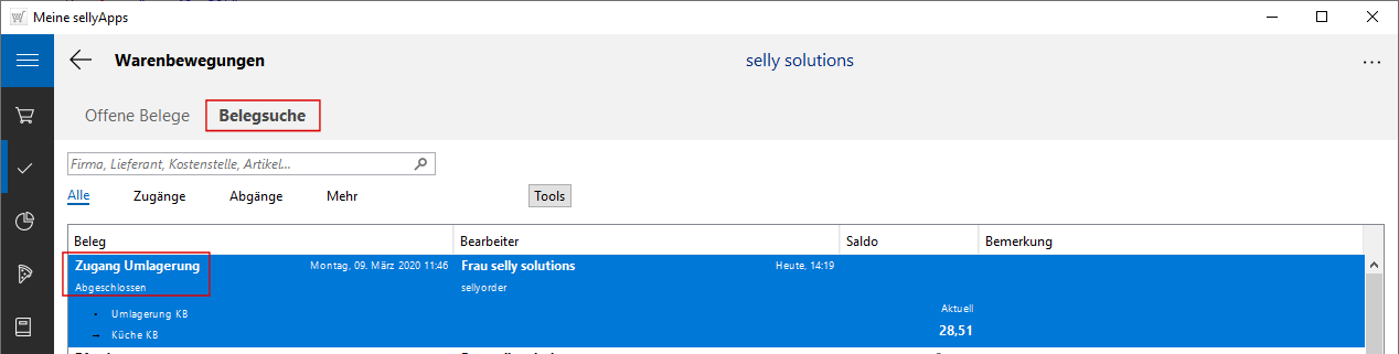 Der abgeschlossene Beleg ist jetzt im Belegarchiv zu finden und hat jetzt den Status Abgeschlossen. Der Aufruf bzw. die Ansicht erfolgt über den Funktionslink Belegsuche.