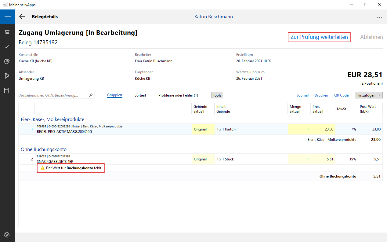 Der Beleg verbleibt auch nach Weiterleitung in der Liste In Bearbeitung und Prüfung, wird jetzt aber mit dem Status In Prüfung gekennzeichnet. Sie müssen für diesen Artikel eine entsprechende Korrektur vornehmen.