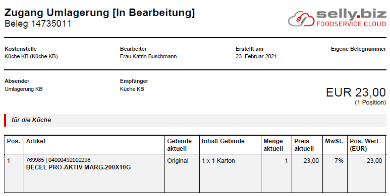 Alle Ihre erzeugten Belege über Warenbewegungen können Sie ausdrucken. Sie öffnen dazu Ihren Beleg in der Detailansicht und nutzen da die
