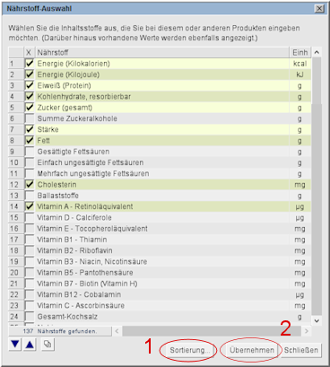 Für eine schnellere Auswahl bzw. bessere Übersicht lässt sich die Nährstoffliste sortieren. Klicken Sie dazu auf [Sortierung...] (s. Markierung 1).