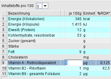 Die Felder der Spalte %RDA* sind editierbar, d.h. Sie können hier eine Prozentangabe