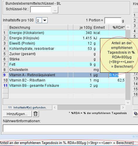 Sie tragen den entsprechenden Wert (im Beispiel 1) ein, klicken in die Spalte %RDA und lassen nachfolgend über die Tastenkombination [Strg] + [Leertaste] sich den %RDA für den aktuellen Nährstoff (im Beispiel Vitamin A - Retinoläquivalent) aus dem eingetragenen Nährwert und dem im Hilfetext angezeigten RDA (im Beispiel 800 µg) berechnen.