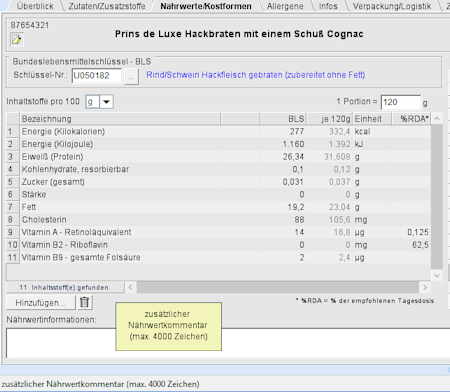 Die Spalte Bezeichnung listet die Nährwerte auf und die nächstfolgende Spalte ermöglicht Zusatzangaben (z. B. >; <; max.).