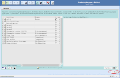 Sollte die Liste nicht alle Symbole (Gütezeichen, Zertifikate, u.a.) enthalten, die Sie benötigen, können Sie diese ergänzen. Das Fenster zum Bearbeiten der Symbole