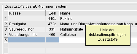 In der Freitextspalte E-Nr kann die von der EU zugelassene E-Nummer eingetragen werden. Da die Zulassung einem stetigen Prozess unterliegt, ist auch