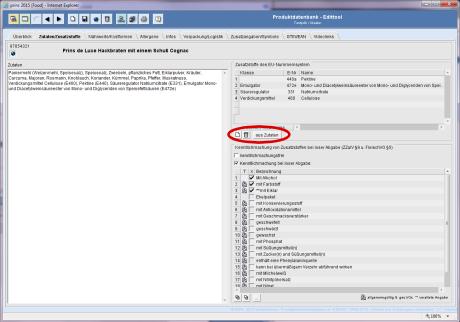 Mit Hilfe der Toolbar erfassen und löschen Sie Zusatzstoffe bzw. übernehmen Zusatzstoffe aus Ihrer Zutatenliste..