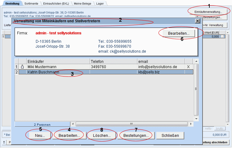 Wählen Sie im Reiter „Bestellung“ den Button „Einkäuferverwaltung“. |
