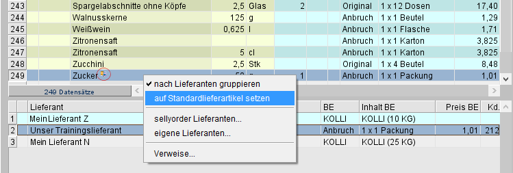 Für Zutaten mit einem alternativen Lieferartikel (LKW-Symbol) gibt es über das Menü der rechten Maustaste nunmehr in der Bedarfsliste die Möglichkeit, den alternativen Lieferartikel auf den Standardlieferartikel zurückzusetzen.