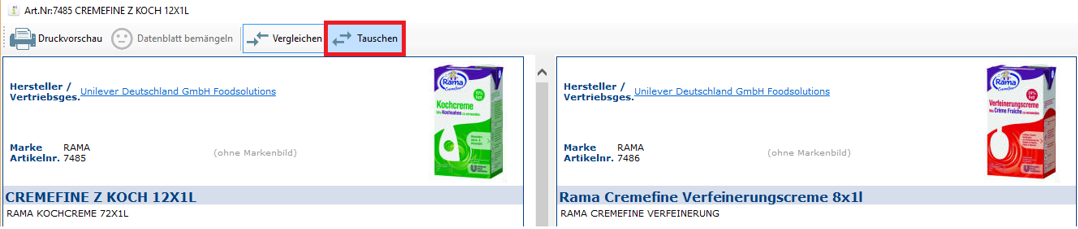 1. Schritt: Tausch der Produkte. Als Ergebnis befindet sich das zuvergleichende Produkt auf der linken Seite (CREMEFINE Z KOCH 12X1L).
