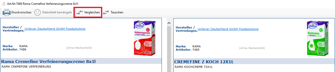 2. Schritt: Rechts wird das Alternativprodukt (RAMA Schlagcreme 72x1L Typ90) zum Vergleich geladen.