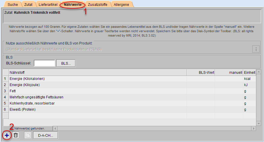 Reiter Nährwerte → Nährwerte zuordnen (über PRiNS, D-A-CH, BLS, manuell)