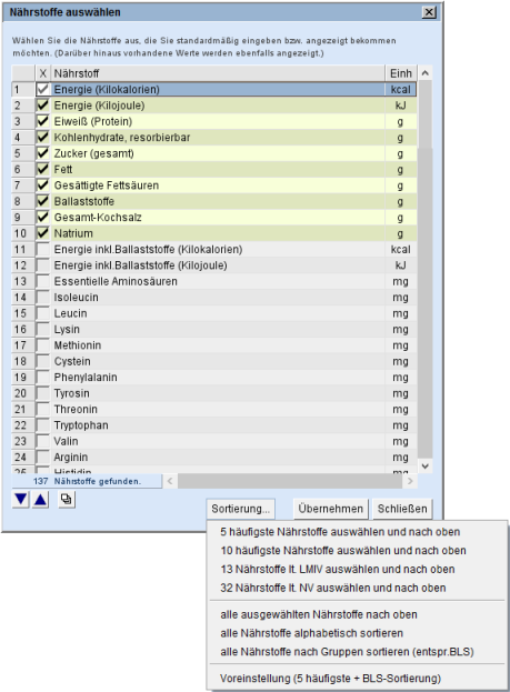 bzw. bessere Übersicht lässt sich die Nährstoffliste sortieren.