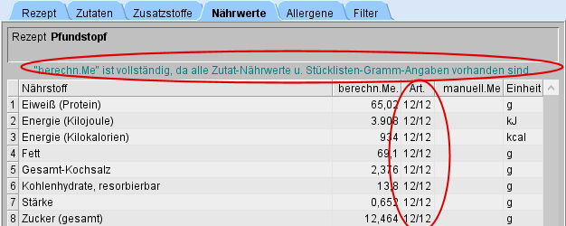 In den Beispiel ist die Nährstoffliste erweitert worden.