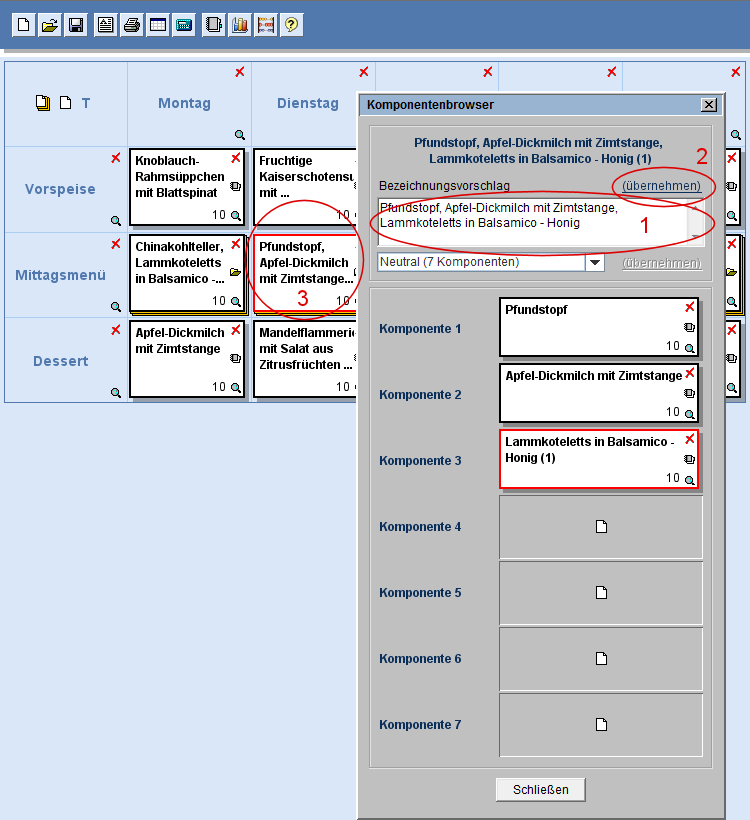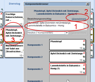 Wählen Sie bspw. Mittagessen (8 Komponenten) und klicken anschließend rechts auf [übernehmen], erhalten Sie 8 Komponentenvorschläge: Vorsuppe,