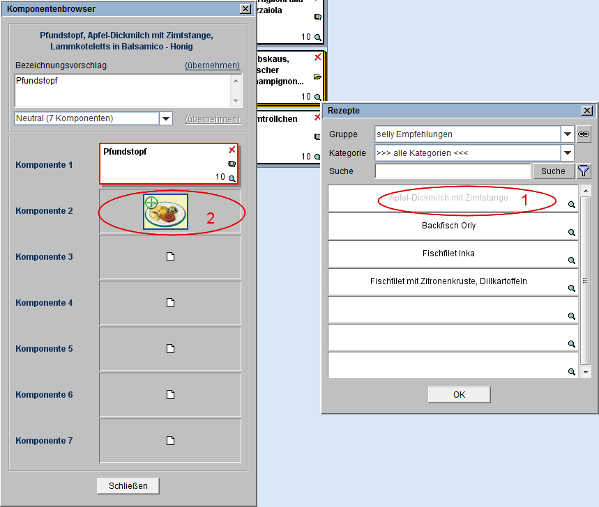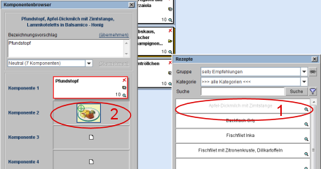 Zur Übernahme des Rezeptes in einen Komponentenbrowser gehen Sie in das Textfeld (s. Markierung 1) der aus-gesuchten Speise mit dem