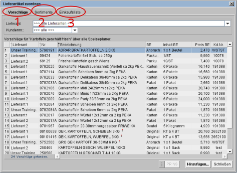Vorschlagsliste aus Lieferartikeln angezeigt, die