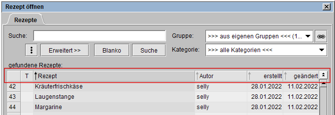 Über die Spaltentitel (s. Markierung rechts) der Rezeptsuche lässt sich eine Änderung der Sortierung innerhalb des Suchergebnisses erreichen.