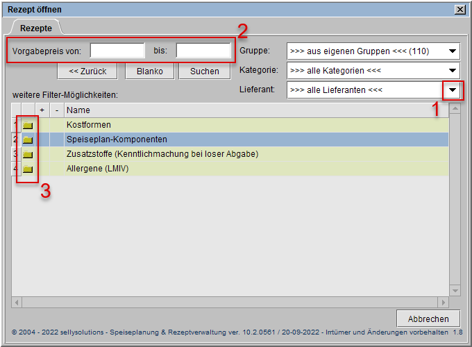 Mit Auswahl eines Eintrages aus der Liste Lieferant (s. Markierung 1) führen Sie eine eingeschränkte Suche nach einem Rezept bzw. Speise durch, das bzw. die eine Verknüpfung mit dem gewählten Lieferanten aufweisen soll.