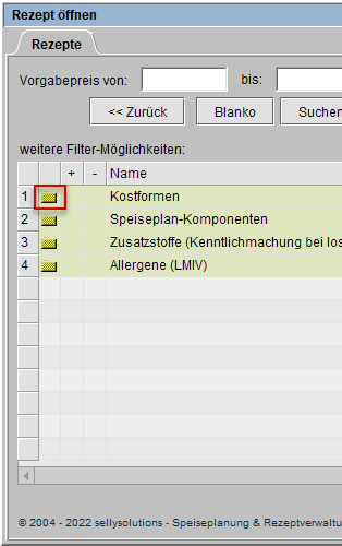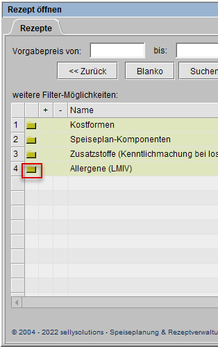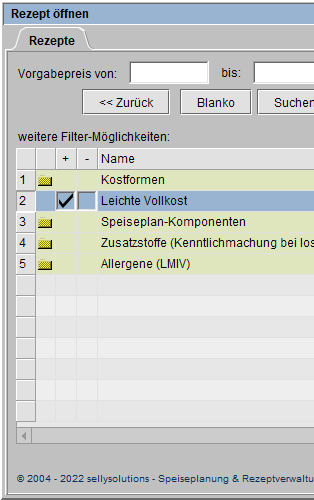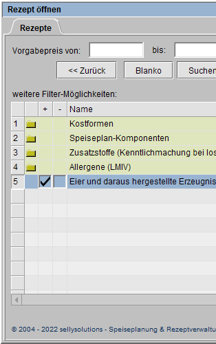 Weitere Filtermöglichkeiten stehen Ihnen in der Tabelle zur Verfügung (s. Markierung 3) , wenn bspw. das Rezept bzw. die Speise einem bestimmten hinterlegten Filter entsprechen soll.